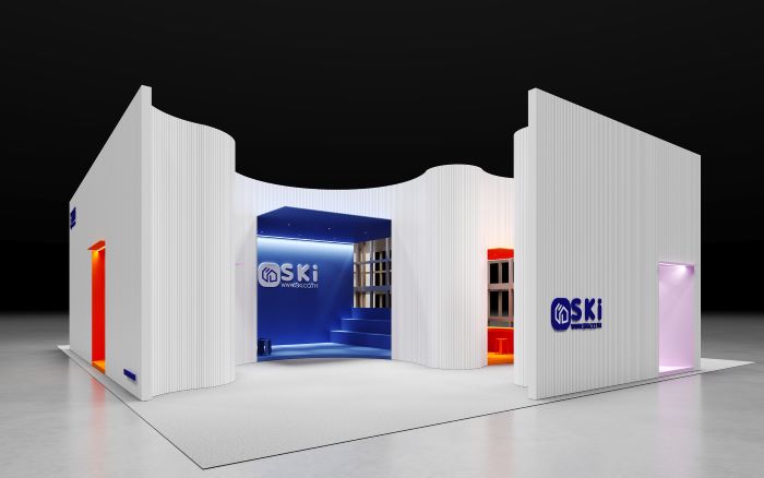 - SKI (Tools and home improvement online store) ออกแบบโดย anonym studio สำหรับการออกแบบพื้นที่โดยรวมเป็นลักษณะของผนังสูงคล้ายรูปลักษณ์ของโกดังหลังใหญ่ ที่ถูกแบ่งโซนจากสี ขนาด ความสูง หรือฟังก์ชันที่ต่างกัน โดยมีการเจาะเป็นกรอบหน้าต่าง (Window Frame) ในตำแหน่งที่ตั้งใจเพื่อให้เห็นถึงผลิตภัณฑ์ที่จัดแสดงอยู่ภายในพื้นที่ด้านหลังห้อง ลักษณะการ Zoning ที่เกิดขึ้นจะเป็นการเชื่อมโยงจากผนังโกดังที่วิ่งตรงแล้วค่อย ๆ โค้งเข้าสู่พื้นที่จัดแสดง ทำหน้าที่เสมือนเป็นพื้นที่เปลี่ยนผ่าน หรือเป็นการเดินทางของผู้ชมงาน ที่ถูกเชื้อเชิญเข้ามาภายใน Pavilion ได้มาทำความรู้จักกับแบรนด์ SKI