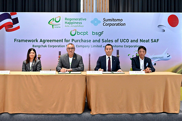 นายธรรมรัตน์ ประยูรสุข รองกรรมการผู้จัดการใหญ่ กลุ่มธุรกิจโรงกลั่นและการค้าน้ำมัน บริษัท บางจาก คอร์ปอเรชั่น จำกัด (มหาชน) ร่วมลงนามกับ Mr. Yutaka Takamura, General Manager of Green Chemical, Strategic Business Unit (SBU), Chemical Solution Group ซูมิโตโม คอร์ปอเรชั่น โดยมี Mr. Takashi Tanaka, General Manager of the Asia & Oceania Chemical Solutions Business Unit at Sumitomo Corporation Asia and Oceania Pte. Ltd. และ นางองค์อร เปลี่ยนรังษี กรรมการผู้จัดการ บริษัท บีซีพีที จำกัด ร่วมลงนามเป็นพยาน นับเป็นการเริ่มต้นความร่วมมือเชิงกลยุทธ์ระหว่างสองบริษัทเพื่อสร้างห่วงโซ่อุปทานการนำน้ำมันปรุงอาหารใช้แล้วมาสู่การผลิตและจำหน่ายน้ำมันเชื้อเพลิงอากาศยานยั่งยืน (UCO-to-SAF) ที่แข็งแกร่งและมีประสิทธิภาพ