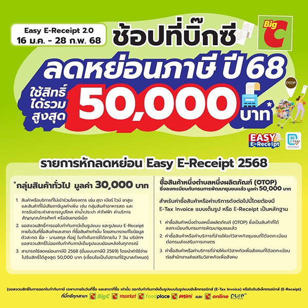 นายอัศวิน กล่าวเสริมว่า สำหรับลูกค้าที่มาซื้อสินค้าที่ บิ๊กซีทุกสาขาทั่วประเทศ รวมทั้งช่องทางออนไลน์ในช่วงเทศกาลตรุษจีนปีนี้ สามารถออกใบกำกับภาษีและนำไปลดหย่อนได้ โดยสามารถดำเนินการได้ที่จุดบริการลูกค้าบิ๊กซีและช่องทางออนไลน์ของบิ๊กซี ยกเว้นสินค้าบางกลุ่ม อาทิ เครื่องดื่มแอลกอฮอล์ ยาสูบ อาหารสดบางรายการ และสินค้าที่ได้รับการยกเว้นภาษี เนื่องจากเราได้ร่วมโครงการ Easy E-Receipt 2.0 ช้อปลดหย่อนภาษีของภาครัฐ เพื่อมอบสิทธิประโยชน์และความคุ้มค่าอันสูงสุดให้กับลูกค้า ซึ่งเชื่อว่าแคมเปญครั้งนี้ จะช่วยกระตุ้นกำลังซื้อของชาวไทยเชื้อสายจีนและผู้บริโภคทั่วประเทศ รวมถึงสามารถผลักดันยอดขายให้เติบโต กว่า 1,180 ล้านบาท อย่างแน่นอน