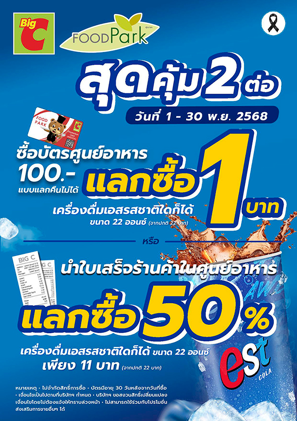 นอกจากดีลจากร้านค้าแล้ว บิ๊กซียังมอบความคุ้มค่าให้กับสายกิน กับโปรโมชั่น “สุดคุ้ม 2 ต่อ” ที่ศูนย์อาหารทั่วประเทศ เพียงซื้อบัตรศูนย์อาหารมูลค่า 100 บาท (แบบไม่แลกคืน) รับสิทธิ์แลกซื้อเครื่องดื่มเอสโคล่า 22 ออนซ์ เพียง 1 บาท หรือใช้ใบเสร็จร้านค้าในศูนย์อาหารแลกซื้อเอสโคล่าได้ในราคาเพียง 11 บาท จากราคาปกติ 22 บาท ตั้งแต่วันนี้ – 30 พฤศจิกายน 2568