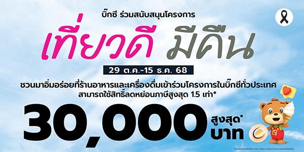 ขณะเดียวกัน ลูกค้ายังสามารถเพลิดเพลินไปกับความคุ้มค่าในโครงการภาครัฐ “เที่ยวดี มีคืน” ที่บิ๊กซีร่วมสนับสนุน เพื่อกระตุ้นการใช้จ่ายภายในประเทศ รับสิทธิลดหย่อนภาษีได้จริงสูงสุดถึง 30,000 บาท สำหรับลูกค้าที่รับประทานอาหารในร้านค้าชั้นนำที่ร่วมรายการทั่วประเทศ อาทิ MK, KFC, Swensen’s, Starbucks, The Pizza Company, Yayoi, Tim Hortons และอีกหลายร้านในศูนย์การค้าบิ๊กซี โดยลูกค้าสามารถขอรับใบกำกับภาษีเต็มรูปแบบได้ทั้งแบบ E-TAX และแบบกระดาษ เพื่อใช้สิทธิลดหย่อนภาษีได้ตามเงื่อนไขของโครงการ ตั้งแต่วันนี้ – 15 ธันวาคม 2568