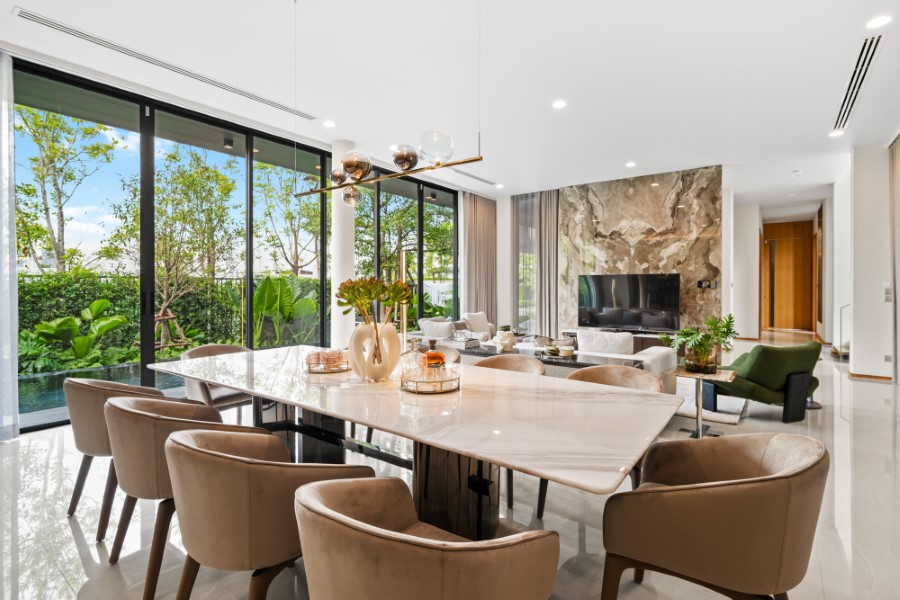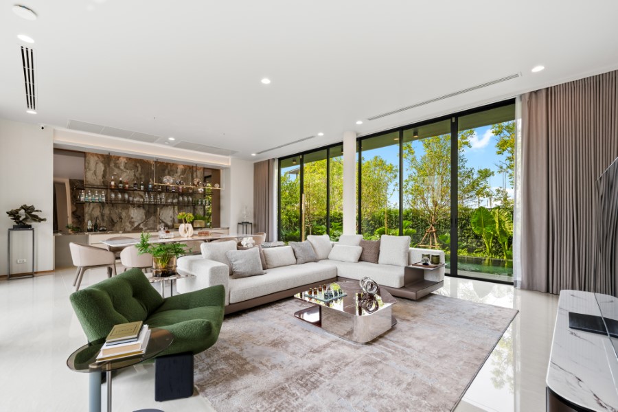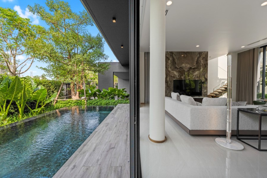 ขณะที่ภายนอกบ้าน มีการแยกโซนของสระว่ายน้ำ และสวน ที่ออกแบบให้สัมพันธ์กับรูปแบบของตัวอาคารหลัก มีการออกแบบพื้นที่ให้เป็นกรีนแอเรีย โอบล้อมด้วยต้นไม้ขนาบกับห้องลิฟวิ่งรูม จัดพื้นที่สวนให้สามารถเชื่อมต่อไปภายในบ้านได้ สามารถนั่งชิลมองธรรมชาติจากในบ้าน หรือ นั่งในสวน ในส่วนของต้นไม้ที่เลือกใช้เน้นไม้ใบสไตล์ทรอปิคอล เพื่อให้บ้านดูเป็นสวนที่ชุ่มชื่น ไม่รกจนเกินไป ดูแลรักษาง่าย โดยต้นไม้ที่เลือกใช้ในการตกแต่งประกอบด้วย ต้นล่ำซำ ต้นกันเกรา ปลูกไว้บริเวณสระว่ายน้ำ รวมถึงต้นปีบบริเวณโถงบันไดเพื่อให้ได้สัมผัสกลิ่นหอม ในราคา 155 ล้านบาท
