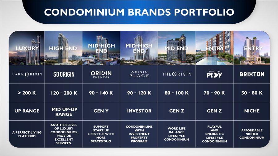 ภาพรวมแบรนด์หลักที่ใช้บุกตลาดคอนโดมิเนียมของเครือออริจิ้นปีนี้ ประกอบด้วย โซ ออริจิ้น (So Origin) คอนโดมิเนียมระดับไฮเอนด์ที่มาพร้อมบริการระดับ Excellent Services ออริจิ้น ปลั๊ก แอนด์ เพลย์ (Origin Plug & Play) เจาะกลุ่มสตาร์ทอัพ ให้พื้นที่กว้างกว่า พร้อมห้องพักแบบ Duo Space เพดานสูง 4.2 เมตรในบางทำเล แฮมป์ตัน (Hampton) และออริจิ้น เพลส (Origin Place) เจาะกลุ่มนักลงทุน ออริจิ้น เพลย์ (Origin Play) เจาะกลุ่ม Gen Z บริกซ์ตัน (Brixton) เจาะกลุ่มนิชมาร์เก็ต เช่น Campus Condo, Pet Lover Condo ในราคาเข้าถึงได้