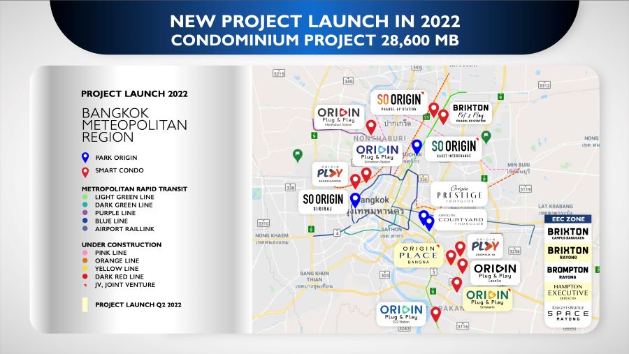 2.บุกทำเลรถไฟฟ้าทั้งปัจจุบันและอนาคต ในอดีตออริจิ้นเติบโตมาจากการใช้กลยุทธ์เจาะตลาดBlue Ocean หรือตลาดศักยภาพที่ยังไม่ค่อยมีการแข่งขันมากนัก ในทำเลรถไฟฟ้าส่วนต่อขยายสายสีเขียวและแถบ EEC วันนี้ ออริจิ้นยังคงเกาะแนวทางเดิมสำหรับแบรนด์ระดับ Entry ไปจนถึง Mid-High End ส่งผลให้ 19 โครงการของออริจิ้นในปีนี้ กระจายตัวบุกไปยังทำเลรถไฟฟ้าที่สร้างเสร็จแล้ว รถไฟฟ้าสายที่อยู่ระหว่างก่อสร้างรวม 8 สายครอบคลุมทั่วพื้นที่กรุงเทพฯและปริมณฑล ได้แก่ สายสีเขียวอ่อน สายสีน้ำเงิน สายสีม่วง สายสีแดง สายสีชมพู สายสีเหลือง สายสีน้ำตาล และสายสีเทา ควบคู่กับการบุก EEC อย่างหนักหน่วงทั้งในชลบุรีและระยอง