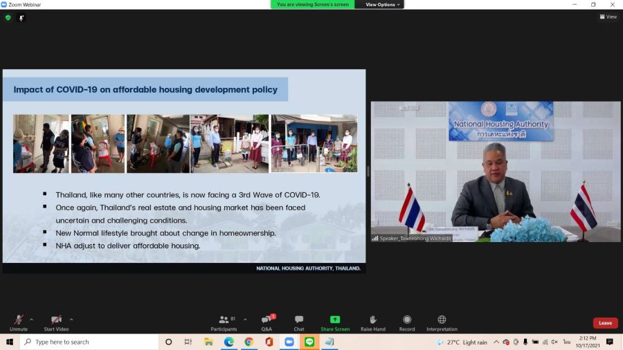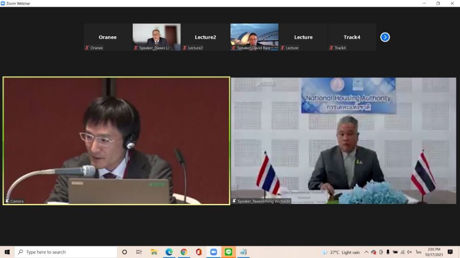 ทั้งนี้ ผู้ว่าการการเคหะแห่งชาติ ได้เข้าร่วมในการประชุม (วาระพิเศษ) หัวข้อ แนวโน้มตลาดที่อยู่อาศัยของทวีปเอเชียและโอเชียเนีย (The Housing Market of Asia & Oceania) และเป็นวิทยากรบรรยายในหัวข้อ แนวโน้มตลาดที่อยู่อาศัยและนโยบายรัฐบาลของประเทศไทย (The Housing Market Trends and Government Policy of Thailand) เกี่ยวกับภาพรวมตลาดอสังหาริมทรัพย์และที่อยู่อาศัยของประเทศไทยในสภาวะการระบาดของ Covid – 19 รวมถึงผลการดำเนินงานและแนวทางการพัฒนาที่อยู่อาศัยในอนาคตของการเคหะแห่งชาติ โดยมีผู้อำนวยการสำนักวิเทศสัมพันธ์ กระทรวงที่ดินโครงสร้างพื้นฐานการขนส่งและการท่องเที่ยวจากประเทศญี่ปุ่น หัวหน้าส่วนสถาบันวิจัยมาตรฐานและบรรทัดฐาน กระทรวงการเคหะและการพัฒนาเมือง-ชนบทจากสาธารณรัฐประชาชนจีน และกรรมการบริหาร New South Wales of Housing Industry Association Ltd (HIA) จากประเทศออสเตรีย ร่วมเป็นวิทยากรในการบรรยายในครั้งนี้ด้วย