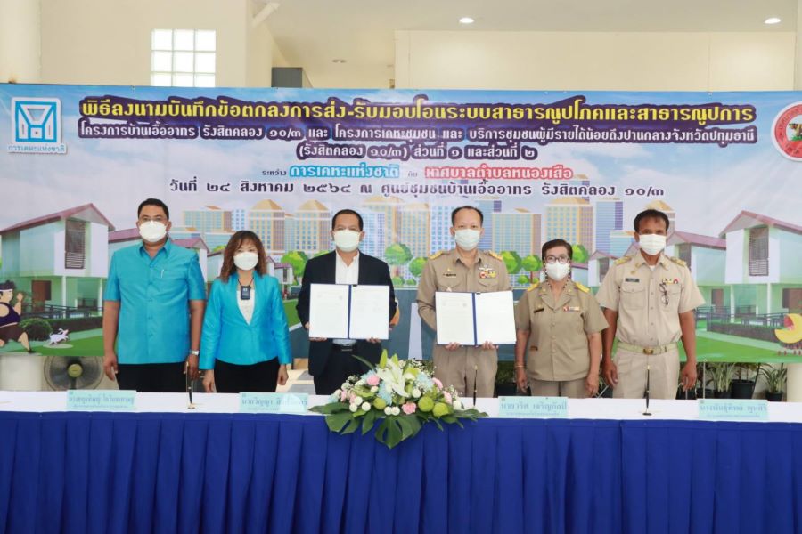 การเคหะแห่งชาติร่วมกับเทศบาลตำบลหนองเสือ จังหวัดปทุมธานี จัดพิธีรับมอบโอนระบบสาธารณูปโภค สาธารณูปการโครงการบ้านเอื้ออาทรรังสิตคลอง 10/3 และโครงการเคหะชุมชนและบริการชุมชนผู้มีรายได้น้อยถึงปานกลาง จังหวัดปทุมธานี (รังสิตคลอง 10/3) ส่วนที่ 1 และส่วนที่ 2 โดยมี นายวิญญา สิงห์อินทร์ รองผู้ว่าการ การเคหะแห่งชาติ เป็นผู้ส่งมอบ และนายวริศ เจริญกัลป์ นายกเทศมนตรีตำบลหนองเสือ เป็นผู้รับมอบ เมื่อเร็วๆ นี้ ณ ศูนย์ชุมชนโครงการบ้านเอื้ออาทรรังสิตคลอง 10/3 จังหวัดปทุมธานี