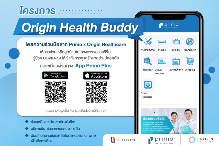 “พรีโม เซอร์วิส โซลูชั่น” จับมือ “ออริจิ้น เฮลท์แคร์” ผุดโครงการ Origin Health Buddy “เราคือเพื่อนคุณ” ส่งมอบความห่วงใย ระดมทีมจัดกล่องยังชีพ สอบถามอาการ และอำนวยความสะดวกให้กับลูกบ้านที่เข้าระบบรักษาแบบ Home Isolation พร้อมเป็นสื่อกลางช่วยประสานไปยังทีมแพทย์เพื่อจัดหาเตียง ผุดฟีเจอร์ใหม่เปิดลงทะเบียนรับการดูแลผ่านแอป Primo Plus ตั้งทีมฉุกเฉินดูแล 24 ชั่วโมง ตลอดการรักษา 14 วัน เร่งสร้างภูมิคุ้มกันหมู่ ปูพรมฉีดวัคซีนเข็มสองให้พนักงานทุกคน พร้อมส่งชุดตรวจเชื้อทุกสัปดาห์ เสริมความมั่นใจให้พนักงานและลูกบ้านออริจิ้นกว่า 20,000 ครอบครัว