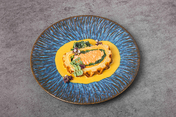 - ฟยอร์ดเทร้าต์นอร์เวย์เวลลิงตัน เสิร์ฟพร้อมกับปูม้า ราดด้วยซอสแกงกะหรี่