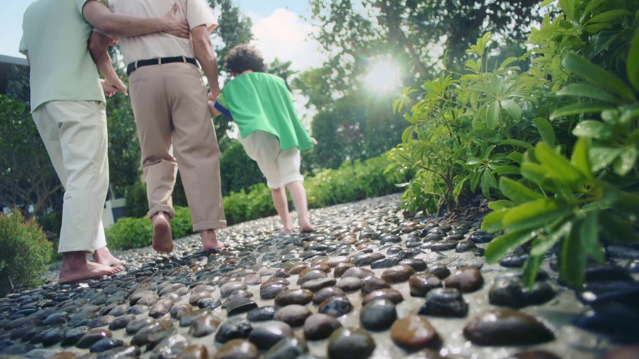 คุณหมอยังบอกด้วยว่า สุขภาพดีเริ่มต้นได้ที่บ้าน ทีมโรงพยาบาลวิมุตเองมีส่วนร่วมนำเสนอไอเดียดีไซน์เพิ่มเติมในโครงการของพฤกษา ในจุดที่คิดว่าสามารถช่วยให้การอยู่อาศัยสะดวกสบายขึ้น เช่น การใช้โถสุขภัณฑ์ที่มีความสูงพอเหมาะรองรับสรีระผู้สูงวัยให้ลุก–นั่งได้สะดวก การออกแบบให้บางส่วนของพื้นที่สีเขียวส่วนกลางของโครงการมีสวนหินบำบัดใช้สำหรับเดินนวดฝ่าเท้า ซึ่งเหมาะกับการออกกำลังกายและฟื้นฟูสุขภาพของผู้สูงวัย หรือแม้แต่การพาเด็กๆ มาเดินเท้าเปล่าบนก้อนหินก็ช่วยส่งเสริม SI (Sensory Integration) การพัฒนาระบบประสาทสัมผัสซึ่งเป็นพัฒนาการสำคัญของเด็กวัยกำลังเจริญเติบโต
