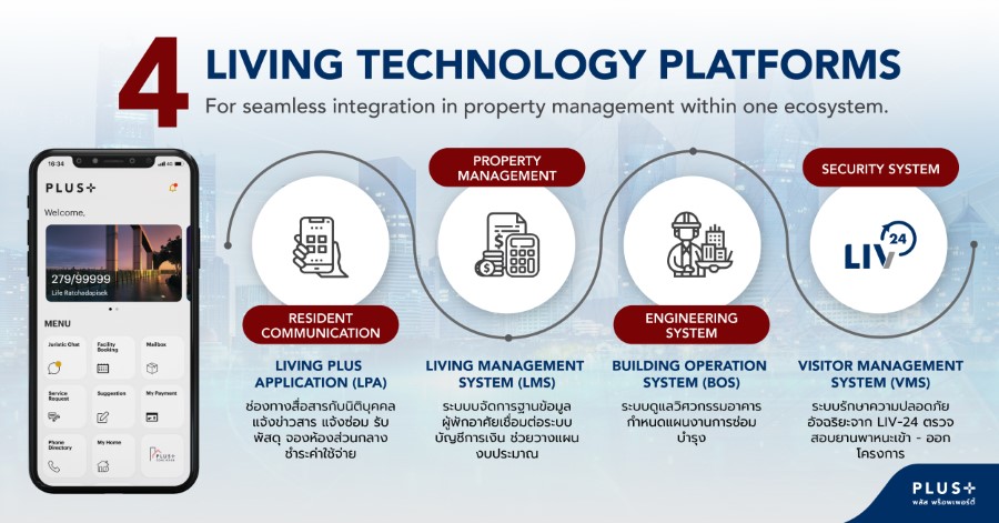 นางสาวนฤมล อาภรณ์ธนกุล ผู้ช่วยกรรมการผู้จัดการฝ่ายบริหารอาคารที่พักอาศัย บริษัท พลัส พร็อพเพอร์ตี้ จำกัด กล่าวว่า “พลัสฯ ได้มีการลงทุนในด้านเทคโนโลยีมาอย่างต่อเนื่อง โดยเชื่อมโยงทุก Platform ให้ครบทุกมิติด้านการบริหารอาคารและที่พักอาศัย เกิดเป็น Ecosystem ที่เชื่อมต่อการทำงานของทั้ง 4 Platforms เข้าหากัน เพื่อนำมาวิเคราะห์ความต้องการของลูกค้า รวมถึงเพิ่มประสิทธิภาพในการสื่อสารและยกระดับมาตรฐานในการบริหารจัดการ ให้สอดรับกับการใช้งานของผู้พักอาศัย เสริมสร้างให้พนักงานทำงานได้อย่างมีประสิทธิภาพเพื่อส่งมอบประสบการณ์ที่ดี พลัสฯ มีการพัฒนาเทคโนโลยี Living Plus Application อย่างต่อเนื่อง ใช้เป็นเครื่องมือสำหรับสื่อสารและให้บริการกับลูกบ้าน ช่วยจัดการเรื่องต่างๆ ในชีวิตให้ได้รับความสะดวกสบาย รวมถึงเป็นช่องทางไว้ติดต่อสื่อสารกับนิติบุคคล อาทิ แจ้งข่าวสารในโครงการ แจ้งซ่อม รับพัสดุ จองห้องส่วนกลาง ชำระค่าใช้จ่ายโดยเชื่อมต่อกับ Platform ของธนาคาร สามารถผ่อนชำระค่าส่วนกลาง หรือชำระผ่านบัตรเครดิตได้ เป็นต้น โดยมีการเก็บข้อมูลการใช้งานจริงจากโครงการต่างๆ มาพัฒนาฟังก์ชันการใช้งานได้ตรงกับความต้องการ นอกจากนี้ยังมีเทคโนโลยี Living Management System (LMS) ที่เป็น Platform ในการบริหารจัดการฐานข้อมูลผู้พักอาศัย โดยเชื่อมต่อระบบบัญชีการเงิน ช่วยในการวางแผนจัดสรรงบประมาณให้มีความเหมาะสม สามารถตรวจสอบสถานะทางการเงินได้อย่างโปร่งใสไม่ว่าจะเป็นการจ่ายค่าส่วนกลาง และค่าสาธารณูปโภค การทำธุรกรรมต่างๆ ยังเป็น Cashless มีความถูกต้องแม่นยำ ตรวจสอบได้ นอกจากเทคโนโลยีที่ดูแลเรื่องการอยู่อาศัยแล้ว ยังมี Platform ที่ใช้สำหรับดูแลระบบวิศวกรรมอาคาร Building Operation System (BOS) ที่เก็บข้อมูลเครื่องจักรในอาคาร มาประมวลผลและกำหนดแผนงานการซ่อมบำรุงที่ชัดเจนในการดูแล โดยเป็นการทำงานแบบ Preventive Maintenance ป้องกันก่อนที่จะเกิดความเสียหาย ซึ่งสามารถควบคุมมาตรฐานของช่างอาคาร ด้วยการสแกน QR Code เพื่อเข้าสู่แอปพลิเคชันเพื่อปฏิบัติงานตามแผนที่วางไว้ สามารถตรวจสอบการทำงาน ลดความผิดพลาดจาก Human Error โดยมีการแจ้งเตือนการทำงานที่ผิดปกติไปที่ผู้ดูแล เพื่อที่จะได้ทำการแก้ไขปัญหาได้ทันท่วงที นอกจากนี้ยังสามารถเชื่อมต่อข้อมูลการแจ้งซ่อมจากผู้พักอาศัย จึงทำให้ฝ่ายจัดการฯ สามารถบริหารงานและติดตามการทำงานได้อย่างต่อเนื่อง โดยที่ผู้พักอาศัยสามารถรับทราบสถานะการให้บริการได้อีกด้วย และสุดท้ายคือระบบการรักษาความปลอดภัยอัจฉริยะจาก LIV-24 ที่เชื่อมต่อระบบ Visitor Management System (VMS) ที่ใช้ในการตรวจสอบยานพาหนะที่เข้