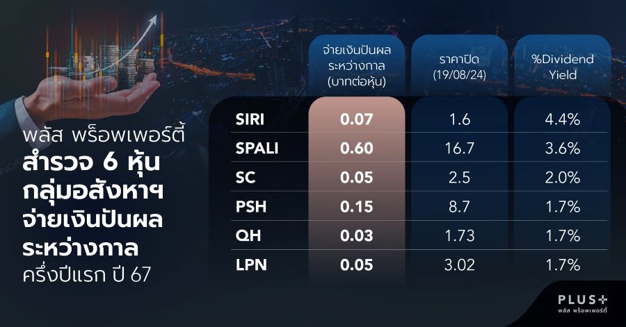 บริษัท พลัส พร็อพเพอร์ตี้ จำกัด ประมวลผลประกอบการของบริษัทอสังหาริมทรัพย์ชั้นนำในช่วงครึ่งปีแรก ปี 2567 พบว่าแม้เศรษฐกิจไทยจะเผชิญความท้าทายจากหนี้ครัวเรือนสูงและอัตราดอกเบี้ยที่ปรับตัวขึ้น แต่บริษัท แสนสิริ จำกัด (มหาชน) ยังคงสามารถขึ้นแท่นทำรายได้รวมได้สูงสุดอันดับ 1 ด้วยรายได้สูงสุดถึง 19,784 ล้านบาท รองลงมาตกเป็นของบริษัท เอพี (ไทยแลนด์) จำกัด (มหาชน) ทำรายได้ไปถึง 17,845 ล้านบาท และ บริษัท แลนด์ แอนด์ เฮ้าส์ จำกัด (มหาชน) ทำรายได้ 14,725 ล้านบาท ติดอันดับท็อป 3 ของตลาดเช่นกัน โดยรายได้รวมของ 10 บริษัทพบว่ามีรายได้รวมมากกว่า 103,184 ล้านบาท นอกจากนี้ ยังพบ 6 หุ้นอสังหาฯ “SIRI, SPALI, SC, PSH, QH, LPN” เตรียมจ่ายปันผลระหว่างกาล นำโดย SIRI ยีลด์สูงสุดที่ 4.4 % และการที่บริษัทเหล่านี้สามารถรักษาผลประกอบการได้ดีในช่วงที่เศรษฐกิจมีความผันผวน สะท้อนให้เห็นถึงความแข็งแกร่งของธุรกิจอสังหาริมทรัพย์ไทย และความสามารถในการปรับตัวของผู้ประกอบการ