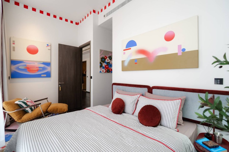 ขณะที่ห้องตัวอย่างที่ 3 “Living Canvas of Playful Energy” สะท้อนตัวตนของคู่รักหรือกลุ่มเพื่อนที่มีทั้งบุคลิกแบบ Introvert และ Extrovert ซึ่งเชื่อมโยงกันด้วยความหลงใหลในกีฬาเทนนิส ภายในห้องโดดเด่นด้วยการใช้คู่สีที่จัดจ้าน (Vibrant Colors) อย่างสีแดงอิฐ สีฟ้า และสีเหลือง พร้อมลายเส้นที่ดูสปอร์ตทันสมัย เต็มไปด้วยความสดใส สร้างบรรยากาศที่สนุกสนาน สะท้อนตัวตนของผู้อยู่อาศัยได้อย่างชัดเจน