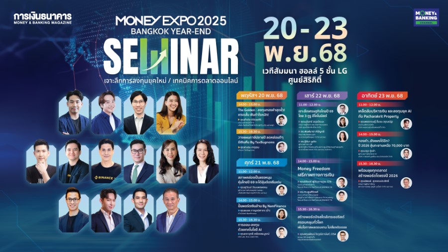 นางสาวภาคนี วิริยะรังสฤษฎ์ ประธานจัดงานร่วม งานมหกรรมการเงิน Money Expo เปิดเผยว่า ได้ร่วมกับพันธมิตรจัดงานสัมมนาภายในงานมหกรรมการเงินกรุงเทพส่งท้ายปี ครั้งที่ 8 MONEY EXPO 2025 BANGKOK YEAR-END ในวันที่ 20-23 พฤศจิกายน 2568 ณ เวทีสัมมนากลาง ฮอลล์ 5 ชั้น LG ศูนย์การประชุมแห่งชาติสิริกิติ์ งานในปีนี้ถือเป็นการรวบรวมความรู้ด้านการเงิน การลงทุน และธุรกิจแบบครบวงจรที่สุดในรอบปี โดยมีกูรูผู้เชี่ยวชาญด้านการลงทุนชั้นนำ พร้อมด้วย อินฟลูเอ็นเซอร์ด้านการเงิน การลงทุน และ อสังหาริมทรัพย์ มาร่วมถ่ายทอดความรู้และประสบการณ์ตรงให้กับผู้เข้าร่วมงาน เพื่อช่วยให้ทุกคนสามารถสร้างกลยุทธ์การลงทุนที่ชาญฉลาด และต่อยอดธุรกิจให้มั่นคงอย่างยั่งยืน พร้อมรับมือเศรษฐกิจที่มีความผันผวนในปี 2569 นอกจากเนื้อหาสัมมนาที่เข้มข้นแล้ว งานสัมมนาครั้งนี้จัดเป็น เวทีสร้างเครือข่ายผู้ประกอบการ นักลงทุน และผู้เชี่ยวชาญตัวจริง ให้ได้พบปะ แลกเปลี่ยนประสบการณ์ และสร้างโอกาสทางธุรกิจร่วมกัน ซึ่งมีหัวข้อสัมมนา ดังนี้