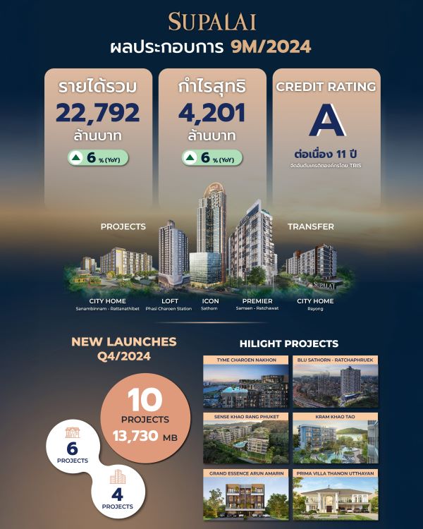 นายไตรเตชะ ตั้งมติธรรม กรรมการผู้จัดการ บริษัท ศุภาลัย จำกัด (มหาชน) กล่าวว่า ภาพรวมผลการดำเนินงานในช่วง 9 เดือนของปี 2567 ถือว่าประสบความสำเร็จทั้งด้านรายได้และกำไร โดยบริษัทฯ สามารถรักษาระดับการเติบโตได้ตามแผนที่วางไว้ โดยกวาดรายได้รวมสูงถึง 22,792 ล้านบาท เพิ่มขึ้น 6% จากช่วงเวลาเดียวกันของปี 2566 และรายได้รวมของไตรมาส 3/2567 เท่ากับ 9,985 ล้านบาท เพิ่มขึ้น 39% เมื่อเทียบกับไตรมาส 3/2566 ซึ่งรายได้หลักสำหรับงวด 9 เดือน ปี 2567 มาจากการโอนกรรมสิทธิ์อสังหาริมทรัพย์ทั้งในกรุงเทพฯ ปริมณฑล และภูมิภาค โดยแบ่งเป็นรายได้โครงการแนวราบ 64% และโครงการคอนโดมิเนียม 36% ซึ่งได้รับแรงหนุนจากการเปิดตัวโครงการใหม่ และกระแสตอบรับที่ดีในกลุ่มสินค้าสร้างเสร็จพร้อมเข้าอยู่ อีกทั้งในช่วงไตรมาส 1-3 ได้มีการโอนกรรมสิทธิ์คอนโดมิเนียมที่สร้างเสร็จ เริ่มทยอยรับรู้รายได้จาก 5 โครงการใหม่ มูลค่ารวมกว่า 16,000 ล้านบาท ได้แก่ ศุภาลัย ไอคอน สาทร, ศุภาลัย พรีเมียร์ สามเสน-ราชวัตร, ศุภาลัย ลอฟท์ สถานีภาษีเจริญ, ซิตี้โฮม สนามบินน้ำ-รัตนาธิเบศร์ และซิตี้โฮม ระยอง นอกจากนี้บริษัทฯ ยังมีสินค้าสร้างเสร็จพร้อมเข้าอยู่ในมืออยู่อีก 28,000 ล้านบาท ซึ่งเป็นอีกหนึ่งตัวชี้วัดที่สำคัญสะท้อนถึงความต้องการของตลาด Real Demand ที่ถือเป็นคีย์ไดรฟ์สำคัญในการเติบโตทางรายได้และกำไรอย่างแข็งแกร่ง