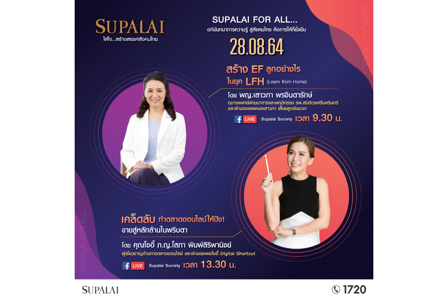บริษัท ศุภาลัย จำกัด (มหาชน) เปิดเวที Live สัมมนาออนไลน์ SUPALAI FOR ALL แบ่งปันความรู้ที่ไม่ควรพลาด! เรียนรู้เพื่อพร้อมรับมือจากผลกระทบวิกฤตโควิด-19 ด้วยความห่วงใยและปรารถนาดีจากศุภาลัย พบสุดยอดวิทยากรที่คุณพ่อคุณแม่ทุกคนจะต้องติดตามและร่วมกดไลค์ กดแชร์กันรัวๆ จากเพจหมอเสาวภา เลี้ยงลูกเชิงบวก และวิทยากรรุ่นใหม่ รู้ทันเทรนด์ “Digital Marketing” จากเพจโซอี้ Digital Shortcut ในวันเสาร์ที่ 28 สิงหาคม 2564 รับชมถ่ายทอดสดออนไลน์ (Live) ผ่าน Facebook : Supalai Society