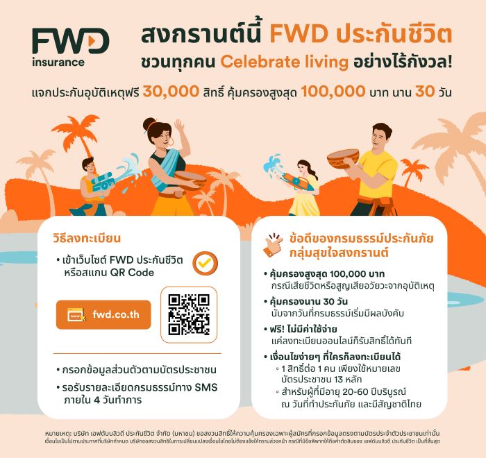 สงกรานต์นี้ไม่ว่าจะไปเที่ยวที่ไหน หรืออยู่บ้านเฉลิมฉลองกับคนที่รัก บริษัท เอฟดับบลิวดี ประกันชีวิต จำกัด (มหาชน) หรือ FWD ประกันชีวิต ขอสนับสนุนให้ทุกคนใช้ชีวิตในช่วงวันหยุดเทศกาลอย่างไร้กังวล มอบ “ประกันอุบัติเหตุฟรี” ภายใต้โครงการ “กรมธรรม์ประกันภัยสุขใจสงกรานต์” คุ้มครองสูงสุด 100,000 บาท นาน 30 วัน เพียงลงทะเบียนออนไลน์ได้ง่ายๆ ตั้งแต่วันที่ 1 เมษายน ถึง 30 มิถุนายน 2568 จำนวนจำกัด 30,000 สิทธิ์