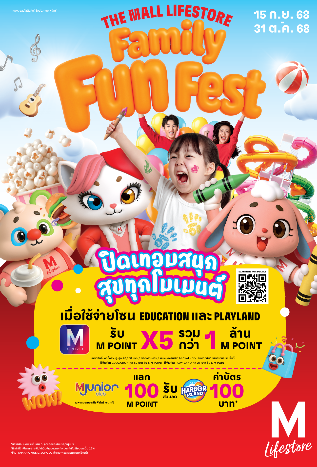 นอกจากนี้ สมาชิก M CARD สามารถรับคะแนน M POINT X5 รับรวมกว่า 1 ล้าน M Point เมื่อใช้จ่ายสถาบันเสริมความรู้ในโซน Education ทุก 50 บาท รับ 1 M Point และโซน Playland ทุก 25 บาท รับ 1 M Point ระหว่างวันที่ 15 กันยายน – 31 ตุลาคม 2568 หรือจนกว่าจะครบสิทธิ์ (จำกัด 1 สิทธิ์ ยอดซื้อรวมสูงสุด 20,000 บาท / ตลอดรายการ / หมายเลขสมาชิก M Card) พิเศษสำหรับ สมาชิก M Card Junior สามารถใช้ 100 M Point แลกรับส่วนลด 100 บาท ค่าบัตรเข้าเล่น Harbor Island ที่เดอะมอลล์ไลฟ์สโตร์ บางกะปิ (จำกัด 200 สิทธิ์ / ตลอดรายการ)