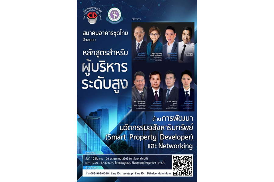 การอบรมหลักสูตรสำหรับผู้บริหารระดับสูงด้านการพัฒนานวัตกรรมอสังหาริมทรัพย์ (Smart Property Developer) และ Networking ได้รับการสนับสนุนทางวิชาการจากวิทยาลัยนานาชาตินวัตกรรมดิจิทัล มหาวิทยาลัยเชียงใหม่และอาจารย์จากจุฬาลงกรณ์มหาวิทยาลัย และวิทยากรผู้ทรงคุณวุฒิในสายงานอสังหาริมทรัพย์สำหรับยุคดิจิทัล โดยจะจัดขึ้นในวันที่ 10 มีนาคม – 26 พฤษภาคม 2565 ทุกวันพฤหัสบดี เวลา 12.00 – 17.30 น. ณ โรงแรมพูลแมน คิงเพาเวอร์ ถนนรางน้ำ กรุงเทพ จึงเป็นเวทีที่รวมนักวิชาด้านเทคโนโลยีและนวัตกรรมผู้ทรงคุณวุฒิจากสถาบันชั้นนำของประเทศ ตลอดจนนักพัฒนาอสังหาริมทรัพย์ที่มากด้วยผลงานและความสามารถ ที่จะมาถ่ายทอดความรู้ และประสบการณ์ เพื่อนำไปต่อยอดในธุรกิจอสังหาริมทรัพย์ และธุรกิจอื่นที่เกี่ยวข้อง ซึ่งคณะกรรมการจัดงานฯ เชื่อมั่นว่าผู้เข้าอบรมในหลักสูตรดังกล่าวจะได้รับความรู้ ตลอดจนการสร้างเครือข่าย และได้รับมิตรภาพที่ดีต่อกันต่อไป กรรมการจัดงานฯ กล่าวในที่สุด