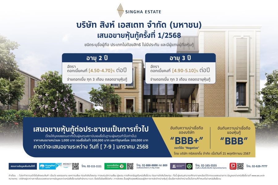 หลังจากประสบความสำเร็จจากการเสนอขายหุ้นกู้ในปี 2566 และเมื่อช่วงต้นปี 2567 ที่ผ่านมา โดยมีมูลค่าการเสนอขายหุ้นกู้ทั้ง 2 ครั้งรวมมูลค่าเสนอขายทั้งสิ้น 2,700 ล้านบาท บริษัท สิงห์ เอสเตท จำกัด (มหาชน) หรือ “S” เตรียมพร้อมที่จะเสนอขายหุ้นกู้ชุดใหม่ต่อประชาชนเป็นการทั่วไป โดยปัจจุบันบริษัทฯ อยู่ระหว่างการยื่นแบบแสดงรายการข้อมูลตราสารหนี้ (filing) เพื่อเสนอขายหุ้นกู้ชนิดระบุชื่อผู้ถือ ประเภทไม่ด้อยสิทธิ ไม่มีประกัน และมีผู้แทนผู้ถือหุ้นกู้ ต่อสำนักงานคณะกรรมการกำกับหลักทรัพย์และตลาดหลักทรัพย์ (ก.ล.ต.) โดยหุ้นกู้ดังกล่าวแบ่งออกเป็น 2 ชุด ได้แก่ ชุดที่ 1 หุ้นกู้อายุ 2 ปี อัตราดอกเบี้ย [4.50 – 4.70]% ต่อปี และ ชุดที่ 2 หุ้นกู้อายุ 3 ปี อัตราดอกเบี้ย [4.90 -5.10]% ต่อปี สำหรับหุ้นกู้ดังกล่าวจะชำระดอกเบี้ยทุก ๆ 3 เดือน กำหนดจองซื้อขั้นต่ำ 100,000 บาท ทวีคูณครั้งละ 100,000 บาท โดยคาดว่าจะเสนอขายต่อประชาชนเป็นการทั่วไประหว่างวันที่ [7 – 9] มกราคม 2568 ทั้งนี้ บริษัทฯ ได้แต่งตั้งสถาบันการเงิน 4 แห่ง เป็นผู้จัดการการจัดจำหน่ายหุ้นกู้ ประกอบด้วย ธนาคารกรุงไทย ธนาคารกสิกรไทย บริษัทหลักทรัพย์ เกียรตินาคินภัทร และธนาคารซีไอเอ็มบี ไทย