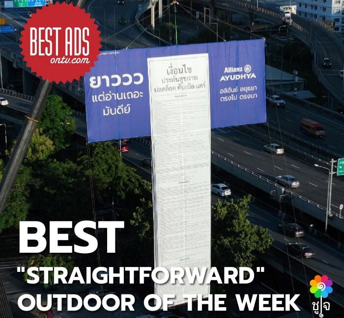 แคมเปญ “ตรงไปตรงมา (Straightforward)” ของ บมจ. อลิอันซ์ อยุธยา ประกันชีวิต ถูกออกแบบเพื่อกระตุ้นให้ผู้บริโภคเห็นถึงความสำคัญของการอ่านและเข้าใจเงื่อนไขประกันก่อนตัดสินใจซื้อ ตอบโจทย์ปัญหาที่วงการมักสื่อสารเพียงผลประโยชน์คุ้มครองจนผู้บริโภครู้สึกถูกเอาเปรียบเมื่อเคลมจริง แคมเปญนี้พลิกเกมด้วยการนำ “เงื่อนไขประกัน” มาขึ้นบิลบอร์ดยักษ์ริมทางด่วน ใช้เครนยกขึ้นฟ้า พร้อมข้อความกระแทกใจ “ยาววว แต่อ่านเถอะ มันดีย์” แสดงจุดยืนแบรนด์ที่กล้าหาญ โปร่งใส และแตกต่าง จนสามารถคว้ารางวัล Best Outdoor Ads จาก Best Ads onTV.com