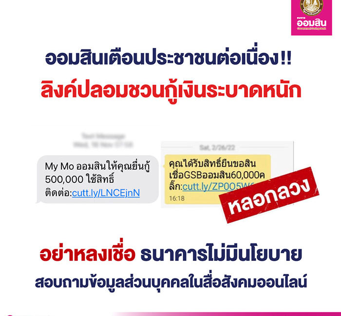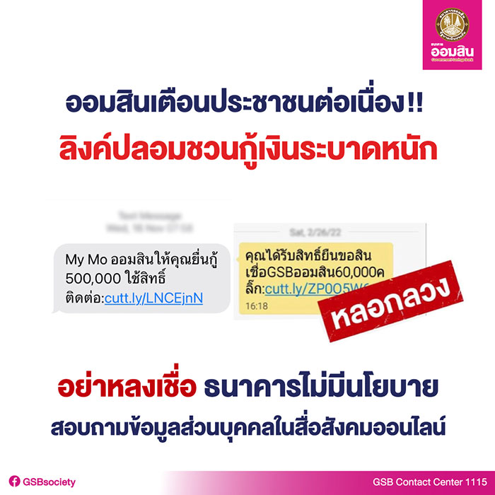 รายงานข่าวจากธนาคารออมสิน แจ้งว่า ขณะนี้ได้มีกลุ่มมิจฉาชีพแอบอ้างใช้ชื่อ “สินเชื่อGSBออมสิน” “My Mo ออมสิน” ตลอดทั้งใช้โลโก้ธนาคาร ส่งข้อความในรูปแบบลิงก์ SMS Line หรือ Facebook เข้ามือถือของลูกค้าและประชาชนจำนวนมาก โดยใช้ข้อความเชิญชวนลักษณะกระตุ้นให้กดรับสิทธิหรือกดลิงก์เข้าไป ทั้งนี้ ลิงก์ข้อความดังกล่าวไม่ใช่ของธนาคารออมสิน ขอให้ลูกค้าและประชาชนอย่าหลงเชื่อ ไม่กดลิงก์ และไม่เพิ่มเพื่อน หรือกรอกข้อความใดๆ เด็ดขาด เพิ่มความระมัดระวังมากยิ่งขึ้น และขอย้ำว่าธนาคารไม่มีนโยบายสอบถามข้อมูลส่วนบุคคลจากลูกค้าในสื่อสังคมออนไลน์ ทั้งนี้ ธนาคารจะดำเนินการเอาผิดทางกฎหมายในลักษณะดังกล่าวให้ถึงที่สุดต่อไป ขอให้ประชาชนติดตามข่าวสารตามช่องทางต่างๆ ของธนาคารออมสิน อาทิ เว็บไซต์ธนาคารออมสิน www.gsb.or.th แอปพลิเคชั่น MyMo , Social Media ช่องทาง GSB Society , GSB NOW หากผู้ใดพบพฤติกรรมเป็นที่น่าสงสัยไปในทางทุจริตหรือหลอกลวง ให้รีบแจ้งธนาคารทาง GSB Contact Center โทร.1115