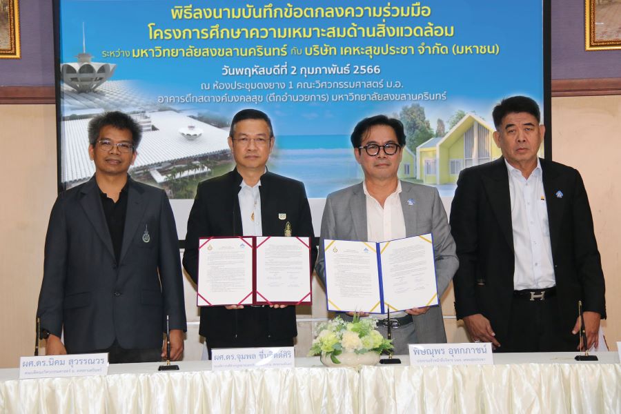 เคหะสุขประชา ร่วมลงนามบันทึกข้อตกลงความร่วมมือกับ “มหาวิทยาลัยสงขลานครินทร์” หรือ ม.อ. ใน “โครงการศึกษาความเหมาะสมด้านสิ่งแวดล้อม” ร่วมกันศึกษาความเป็นไปได้ด้านสิ่งแวดล้อม เพื่อการลงทุนและบริหารจัดการด้านอสังหาริมทรัพย์ แผนพัฒนาเศรษฐกิจชุมชน และการบริหารทรัพย์สินรอการพัฒนา ให้เกิดประสิทธิภาพ พร้อมนำองค์ความรู้ ความเป็นมืออาชีพ และนวัตกรรมจาก ม.อ. มาใช้อย่างครอบคลุม ต่อยอดให้เกิดชุมชนในพื้นที่เกิดความรู้ที่หลากหลายและเกิดการพัฒนาบนพื้นฐานการรักษ์โลก