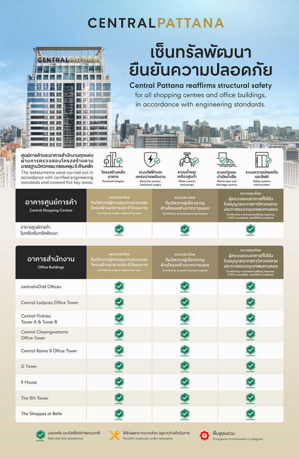บริษัท เซ็นทรัลพัฒนา จำกัด (มหาชน) ย้ำบทบาทองค์กรที่อยู่เคียงข้างคนไทยและเป็นศูนย์กลางการใช้ชีวิตที่ดูแลทุกคน โดยจากเหตุการณ์แผ่นดินไหวที่ผ่านมาได้ดูแลความปลอดภัยของลูกค้า ร้านค้าผู้ประกอบการ และพนักงาน รวมถึงทุกอาคารศูนย์การค้าและอาคารสำนักงานได้ผ่านการตรวจสอบความปลอดภัยอย่างละเอียด โดยวิศวกรโครงสร้างอาคารผู้เชี่ยวชาญจากภายนอกร่วมกับผู้ตรวจสอบอาคารที่ได้รับใบอนุญาตจากสภาวิศวกร ตามหลักมาตรฐานวิศวกรรม ซึ่งผลการตรวจสอบยืนยันอาคารมีความมั่นคงแข็งแรง ปลอดภัย