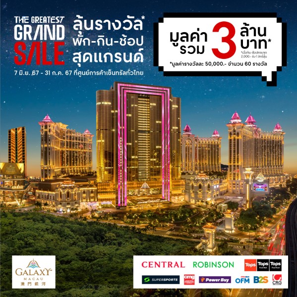 บริษัท เซ็นทรัลพัฒนา จำกัด (มหาชน) ผนึกกำลังธุรกิจในเครือกลุ่มเซ็นทรัลและพาร์ทเนอร์ธุรกิจชั้นนำทั่วประเทศ ทั้งภาครัฐและเอกชน เปิดแคมเปญ The Greatest Grand Sale 2024 มหกรรมเซลกลางปีที่ดีที่สุด เทศกาลเซลใหญ่ระดับชาติ ที่นักช้อปห้ามพลาด ลดทั้งศูนย์ฯ-ห้างฯ-ออนไลน์ อัดส่วนลดสูงสุด 80% จาก 12,000 ร้านค้า รวมกว่า 25,000 แบรนด์ เริ่ม 7 มิ.ย. – 31 ก.ค. 2567 ที่ศูนย์การค้าเซ็นทรัลทั่วประเทศ และดิเอสพละนาด รัชดาภิเษก พร้อมจับมือ Galaxy Macau จุดหมายปลายทางรีสอร์ทหรูครบวงจรชั้นนำระดับโลกในมาเก๊า มอบของรางวัลสุดพิเศษ สมาชิก The 1 กิน-ช้อป ที่ศูนย์การค้าเซ็นทรัล ลุ้นแพกเกจห้องพักโรงแรม Andaz Macau 2 คืน พร้อมบัตรรับประทานอาหาร Galaxy Macau