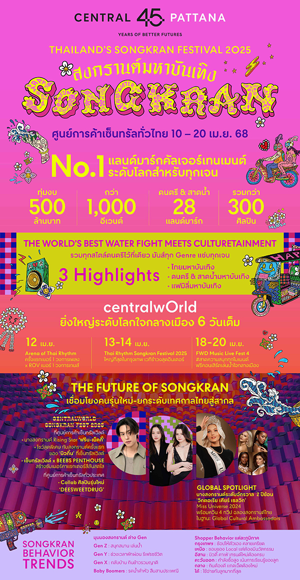 จากอินไซต์ลูกค้า พบว่า แต่ละเจนฯ มีการฉลองสงกรานต์แตกต่างกัน โดย Gen Z มองว่าสงกรานต์คือ ความสนุก เอนเตอร์เทนเมนต์ และการแสดงตัวตนผ่านคอนเสิร์ตและการแต่งตัว , Gen Y มองหาช่วงเวลาพักผ่อน รีเฟรชชีวิต, Gen X และ Baby Boomers ยังคงยึดโยงกับคุณค่าทางจิตใจผ่านการกลับบ้าน รดน้ำดำหัว และสืบสานประเพณี ขณะที่ Gen Alpha ต้องการพื้นที่สนุกและปลอดภัยที่ทั้งครอบครัวสามารถร่วมกิจกรรมได้พร้อมกัน เราจึงดีไซน์ประสบการณ์แบบ Tailor-made ให้ตอบโจทย์ทุกเจนฯ ไม่ว่าจะเป็น งาน CPOT ของดีทั่วไทย สุขใจรับสงกรานต์ ที่เซ็นทรัลเวิลด์ร่วมกับกระทรวงวัฒนธรรม รวบรวมสินค้าทางวัฒนธรรมจาก 77 จังหวัดทั่วประเทศ ยกระดับสินค้าไทยสู่สากลแบบร่วมสมัย และตลาดสินค้าวัฒนธรรมในหลายสาขาทั่วประเทศให้ ช้อป ชิม ลิ้มรส อาหารไทยพื้นถิ่น, กิจกรรมไทยมหาบันเทิง จัดแสดงมรดกทางวัฒนธรรมที่หาชมได้ยาก อาทิ โขน, หุ่นละครเล็ก, รำมโนราห์, นาฏศิลป์ไทย และการแสดงรำไทยประยุกต์ร่วมสมัย รวมทั้งร่วมกับกระทรวงวัฒนธรรม จัดการแสดงกระบี่กระบอง, การแสดงเซิ้งโปงลาง และการแสดงเริงรื่นชื่นสงกรานต์ ร่วมกับ Playland สร้างแลนด์มาร์กสำหรับเด็กๆ และครอบครัว ทั้งลานเล่นน้ำ สวนสนุกเป่าลมและบ่อบอล พร้อม Snoopy Family Zone ให้น้องๆ ได้สนุกกับเครื่องเล่นต่างๆ และการประกวดหนูน้อยสงกรานต์ที่ 10 สาขาทั่วไทย และพื้นที่ Petsumers ให้สัตว์เลี้ยงเล่นน้ำได้ และไฮไลต์แห่งปีกับ The World’s Best Water Fight Entertainment 28 แลนด์มาร์กสาดน้ำสุดมันส์ พร้อมศิลปินกว่า 300 ชีวิตทั่วประเทศ รวมทุกแนวเพลง ทั้งลูกทุ่ง, EDM, Pop, และ Hip-hop สร้างปรากฏการณ์สงกรานต์ที่รวมทุกสไตล์ดนตรีไว้ในที่เดียว ต่อเนื่องกับการดึงศิลปินรุ่นใหม่เจาะกลุ่ม Gen Z นำโดย ‘ฟรีน-เบ็คกี้’ สองสาวฮอตที่สุดตอนนี้กับบทบาทของนางสงกรานต์คู่กันครั้งแรกที่เซ็นทรัลเวิลด์(13 เม.ย.) และ ปีแรกกับการฉลองสงกรานต์สุดบันเทิงไปกับการแสดงสุดพิเศษของ ‘บิวกิ้น’ (14 เม.ย.) ณ ลานมหาสุข เซ็นทรัลเวิลด์ โดยศูนย์การค้าทั่วประเทศได้ Collab กับอาร์ตทิสต์รุ่นใหม่ สร้าง Vibe การตกแต่งศูนย์ฯ จากผลงาน “DEESWEETDRUG” และ ที่เซ็นทรัลเวิลด์กับซัมเมอร์คาแรกเตอร์สีสันสดใสผลงาน BEEBS PENTHOUSE