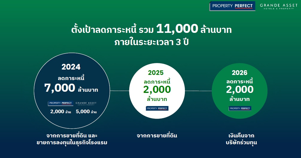 “ปีนี้กลุ่มบริษัทยังมีนโยบายสร้างความมั่นคงด้านการเงิน ให้ความสำคัญกับการลดภาระหนี้มากกว่าการขยายตัว โดยมาจากการขายที่ดินและขายการลงทุนในธุรกิจโรงแรมจากพร็อพเพอร์ตี้ เพอร์เฟค 2,000 ล้านบาท แกรนด์ แอสเสทฯ 5,000 ล้านบาท รวมเป็น 7,000 ล้านบาท นอกจากนี้ยังมีแผนลดภาระหนี้ของพร็อพเพอร์ตี้ เพอร์เฟค ใน 2 ปีข้างหน้าอีกปีละ 2,000 ล้านบาท จากการขายที่ดินและเงินคืนจากบริษัทร่วมทุน ซึ่งจะทำให้กลุ่มบริษัทสามารถลดภาระหนี้ลงรวม 11,000 ล้านบาท ภายในระยะเวลา 3 ปี”