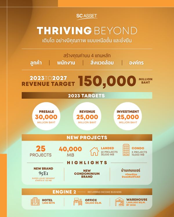 ด้านนายณัฐพงศ์ คุณากรวงศ์ ประธานเจ้าหน้าที่บริหาร บริษัท เอสซี แอสเสท คอร์ปอเรชั่น จำกัด (มหาชน) หรือ SC กล่าวว่า 5 ปีนับจากนี้ (2566 – 2570) บริษัทจะขับเคลื่อนบนยุทธศาสตร์ SC Thriving Beyond เติบโตอย่างมีคุณภาพ แบบเหนือชั้น และยั่งยืน มุ่งสร้างคุณค่า สู่คนและโลก โดยตั้งเป้า 5 ปี ทะยานสู่รายได้ 150,000 ล้านบาท