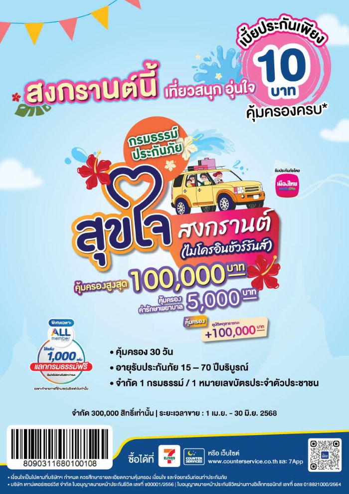 เมืองไทยประกันชีวิต จับมือ เคาน์เตอร์เซอร์วิส ร่วมส่งมอบความสุขและความอุ่นใจไปยังลูกค้าและประชาชนทั่วประเทศ ผ่าน “กรมธรรม์ประกันภัยสุขใจสงกรานต์ (ไมโครอินชัวรันส์)” ประกันภัยอุบัติเหตุกลุ่มที่ให้ ความคุ้มครองครอบคลุมทั้งด้านชีวิตและค่ารักษาพยาบาลเนื่องจากอุบัติเหตุ สามารถซื้อหรือใช้คะเเนน All Member แลกรับสิทธิ์ ได้แล้วตั้งแต่วันที่ 1 เมษายน 2568 – 30 มิถุนายน 2568 ที่ร้านเซเว่นอีเลฟเว่น กว่า 15,000 สาขาทั่วประเทศ หรือที่เว็บไซต์ www.counterservice.co.th