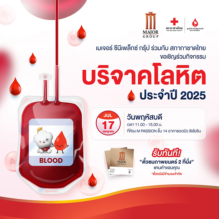 เมเจอร์ ซีนีเพล็กซ์ กรุ้ป ร่วมกับ ศูนย์บริการโลหิตแห่งชาติ สภากาชาดไทย จัดกิจกรรมบริจาคโลหิตเพื่อช่วยเหลือชีวิตเพื่อนมนุษย์อย่างต่อเนื่องทุก 3 เดือน ส่งเสริมการทำบุญด้วยการแบ่งปันและร่วมสนับสนุนการจัดหาโลหิตสำรองให้กับ สภากาชาดไทย นำไปใช้ในทางการแพทย์ทั้งในภาวะฉุกเฉินและรักษาผู้ป่วยที่มีความต้องการความช่วยเหลือเร่งด่วน ซึ่งปีนี้จัดขึ้นเป็นครั้งที่ 3 ชวนจิตอาสาร่วมทำบุญใหญ่ด้วยการร่วมบริจาคโลหิต ณ จุดรับบริจาคโลหิตในวันที่ 17 กรกฎาคม 2568 ตั้งแต่เวลา 11.00 – 15.00 น. ณ ห้อง M Passion ชั้น 14 อาคารอเวนิว เมเจอร์ ซีนีเพล็กซ์ รัชโยธิน มาร่วมกันเป็น “ผู้ให้” เพื่อส่งมอบพลังและโอกาสแด่เพื่อนมนุษย์ รับฟรี!! ตั๋วหนัง 2 ที่นั่ง เป็นของที่ระลึกแทนคำขอบคุณ
