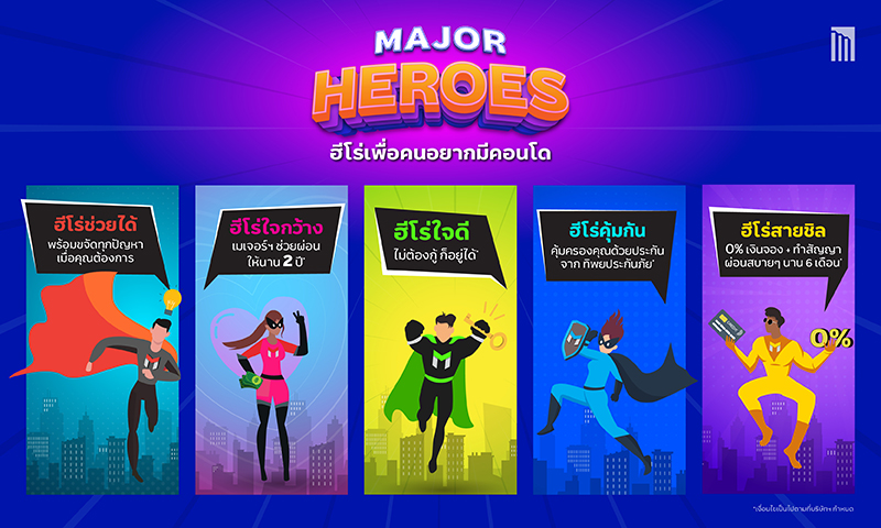 สำหรับแคมเปญ MAJOR HEROES – ฮีโร่เพื่อคนอยากมีคอนโด” จะเข้ามาช่วยแก้ไขปัญหาและลดความกังวลใจเพื่อตอบโจทย์ทุกความต้องการของลูกค้าอย่างครบมิติ โดยแบ่งออกเป็น 5 ฮีโร่ มาตรการ ได้แก่