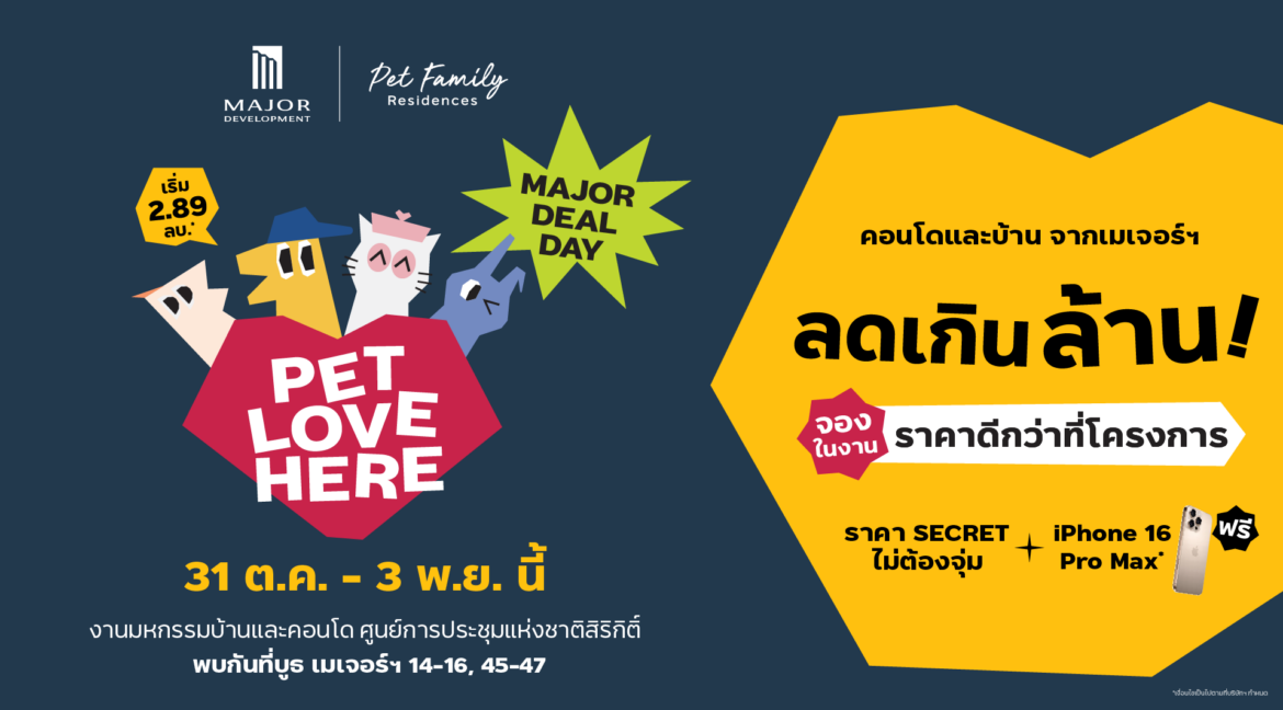 บริษัท เมเจอร์ ดีเวลลอปเม้นท์ จำกัด (มหาชน) ผู้นำด้านการพัฒนาธุรกิจอสังหาริมทรัพย์ระดับลักชูรีและผู้บุกเบิกแนวคิดคอนโดมิเนียมเลี้ยงสัตว์ได้ (Pet Family Residences) จัดเต็มความคุ้มค่า ลดกระหน่ำทุกดีลรับซีซันใหม่ส่งท้ายปี ขนกองทัพโครงการคุณภาพบน Prime Location รวม 8 โครงการ ตอบสนองความต้องการด้านไลฟ์สไตล์ให้ครบทุกครอบครัว ในงานมหกรรมบ้านและคอนโด ครั้งที่ 46 ณ ศูนย์ประชุมแห่งชาติสิริกิติ์ ระหว่างวันที่ 31 ตุลาคม – 3 พฤษจิกายน พ.ศ.2567 เตรียมต้อนรับผู้ที่สนใจเข้าชมบ้านและคอนโดมิเนียมภายในงาน พบโปรโมชันสุดฮอตให้ถึง 2 ดีล และส่วนลดสูงสุดถึง 5 ล้านบาท