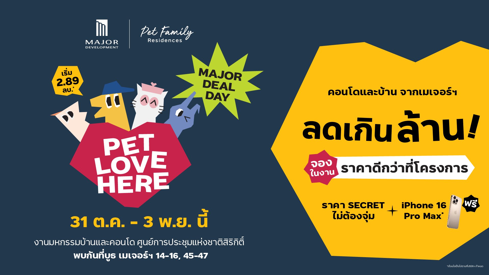 โปรโมชัน “PET LOVE HERE เลี้ยงสัตว์ได้ทุกโครงการ” โปรโมชันเอาใจ Pet Lover กับโครงการเลี้ยงสัตว์ได้ คนเลี้ยงก็ใจฟู น้องๆ หนูๆ ก็แฮปปี้ มาพร้อมดีลเด็ดติดไฟ จองภายในงานการันตีราคาดีกว่าที่โครงการ คุ้มที่สุดในรอบปี รับส่วนลด ON-TOP สุดพิเศษ รับฟรี  iPhone 16 Pro Max กับ 3 โครงการ