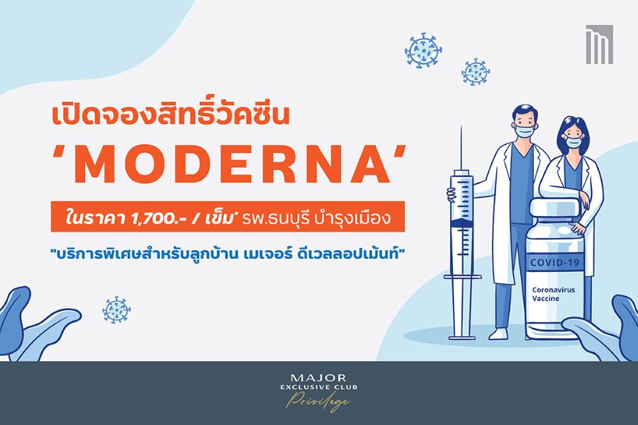 “เมเจอร์ ดีเวลลอปเม้นท์” เข้าใจถึงความกังวลใจกับสถานการณ์การแพร่ระบาดของไวรัสโควิด-19 ในปัจจุบัน นอกจากมาตรการดูแลความสะอาดและความปลอดภัยในทุกโครงการอย่างเข้มข้นแล้ว ยังยกระดับไปอีกขั้น ด้วยการประสานโรงพยาบาลชั้นนำในการสำรองสิทธิ์การฉีดวัคซีน Moderna ให้กับพนักงาน ครอบครัวพนักงาน คู่ค้า รวมไปถึงลูกบ้านทุกโครงการที่สนใจลงทะเบียนรับวัคซีน เพื่อเป้าหมายในการสร้างเกราะป้องกันโควิด-19 ให้กับทุกครอบครัวที่ เมเจอร์ ดีเวลลอปเม้นท์ จะมีส่วนช่วยในการดูแลได้