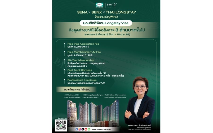 บริษัท เสนาดีเวลลอปเม้นท์ จำกัด (มหาชน) หรือ SENA ร่วมกับ บริษัท ไทยจัดการลองสเตย์ จำกัด (TLM) เปิดตัวแคมเปญพิเศษเพื่อดึงดูดชาวต่างชาติให้เข้ามาลงทุนและอยู่อาศัยในประเทศไทย โดยมอบสิทธิประโยชน์สำหรับผู้ซื้อคอนโดมิเนียมพร้อมอยู่ของ SENA มูลค่า 3 ล้านบาทขึ้นไป รับส่วนลดและสิทธิพิเศษ พร้อมบริการอำนวยความสะดวกด้านวีซ่าพำนักระยะยาว 1 ปี สอดรับกับแนวโน้มการเติบโตของกลุ่มชาวต่างชาติที่มองหาประเทศปลายทางสำหรับการใช้ชีวิตระยะยาว และสนับสนุนประเทศไทยสู่การเป็น World-Class Living Destination ความร่วมมือครั้งนี้ตอกย้ำกลยุทธ์ของกลุ่มเสนาในการขยายฐานลูกค้าสู่ตลาดต่างชาติ ผ่านการผสานความแข็งแกร่งของ SENA ผู้พัฒนาโครงการที่อยู่อาศัยที่มุ่งสร้างคุณภาพชีวิตที่ดีและเข้าถึงได้ ควบคู่การพัฒนานวัตกรรมการอยู่อาศัยอย่างยั่งยืน กับ TLM ผู้เชี่ยวชาญด้านบริการ Long Stay สำหรับชาวต่างชาติ เพื่อสนับสนุนระบบนิเวศการอยู่อาศัยและการลงทุนในประเทศไทย