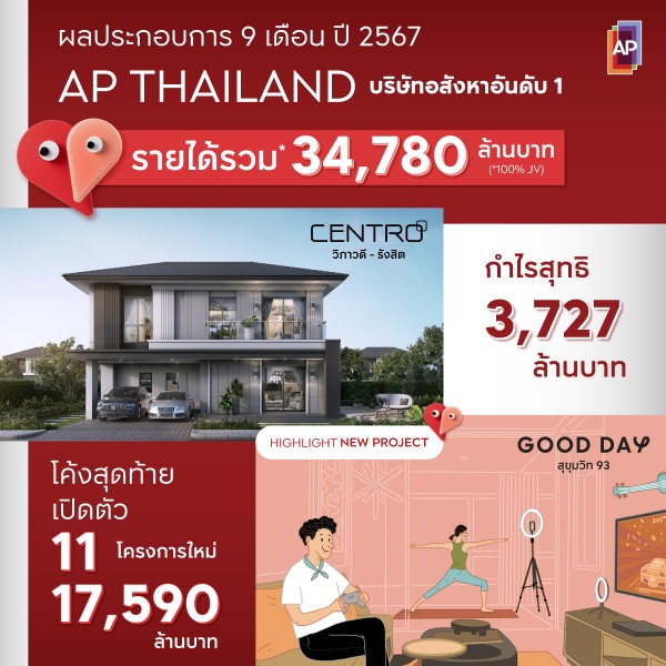 เอพี ไทยแลนด์ เผยผลการดำเนินงาน 9 เดือนแรก โกยรายได้รวม 34,780 ล้านบาท กำไรสุทธิแตะ 3,727 ล้านบาท ผลความสำเร็จจากการเติมเต็มครบทุกพอร์ตสินค้า บ้านเดี่ยว บ้านแฝด ทาวน์โฮม และคอนโดมิเนียมทั้งกรุงเทพฯ และต่างจังหวัด แย้มไตรมาสสุดท้ายเปิดตัวต่อเนื่อง 11 โครงการใหม่ มูลค่ารวมกว่า 17,590 ล้านบาท