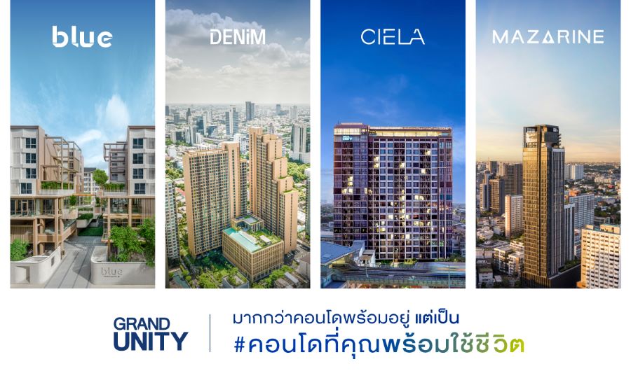 แกรนด์ ยูนิตี้ เปิดตัวแคมเปญ “#คอนโดที่คุณพร้อมใช้ชีวิต” ประกาศจุดยืนแบรนด์ที่มุ่งพัฒนาโครงการเพื่อตอบโจทย์ทุกไลฟ์ไตล์การอยู่อาศัยของทุกเจเนอเรชั่น สอดรับกับคอนโดมิเนียมจาก แกรนด์ ยูนิตี้ ที่ปัจจุบันสร้างเสร็จพร้อมเข้าอยู่ทุกโครงการ ชู 4 แบรนด์เรือธง จาก “BLUE Series”  ได้แก่ บลู (blue), เดนิม  (DENIM), เซียล่า (CIELA) และแมสซารีน (MAZARINE) พร้อมไฮไลต์จุดเด่นด้านทำเลใกล้รถไฟฟ้า ที่มาพร้อมความคุ้มค่า ด้วยราคาและโปรโมชั่นสุดพิเศษ ตั้งแต่วันนี้ – 30 ก.ย.67