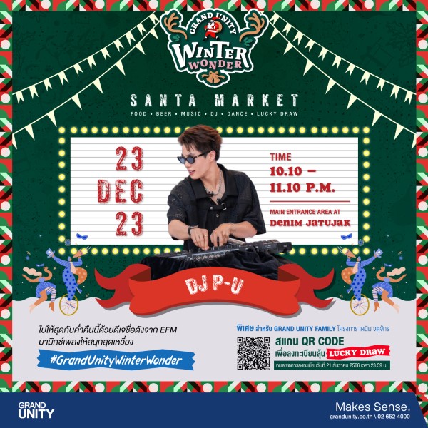 “สำหรับกิจกรรม “Santa Market @ เดนิม จตุจักร” ถือเป็นการเฉลิมฉลองเทศกาลแห่งความสุขส่งท้ายปีร่วมกับสมาชิกครอบครัว GRAND UNITY Family โดยสร้างสรรค์งานขึ้นจากธีม Grand Unity Winter Wonder ที่ตั้งใจจำลองบรรยากาศเทศกาลคริสต์มาสแบบคลาสสิค แต่เสริมด้วยดีเทลเท่ๆ ตามแบบฉบับของ โครงการ เดนิม จตุจักร โดยภายในงานนี้ เราตั้งใจส่งมอบประสบการณ์ความสุขผ่าน 3 องค์ประกอบหลัก ได้แก่ Taste / Scene / Sound ซึ่งเป็นองค์ประกอบที่สำคัญสำหรับงานเฉลิมฉลอง โดยรับประกันความเพลิดเพลินด้านรสชาติ (Taste) ด้วยร้านอาหารหลากสัญชาติหลายรูปแบบ นำขบวนด้วยร้านข้าวอบเนื้อตุ๋นชื่อดังอย่าง “26Braised Beef หรือ ยี่/สับ/หลก สาขาเจริญกรุง” ร้านแนะนำในมิชลิน ไกด์ ประเทศไทย 4 ปีซ้อน ที่มาพร้อมเมนูฉบับย่อ “26Express โดย ยี่ สับ หลก” แต่ยังอัดแน่นด้วยคุณภาพและความอร่อยเช่นเดิม โดยมีไฮไลท์คือ เปาเนื้อตุ๋นยี่สับหลก และข้าวหมูกะทะยี่สับหลก นอกจากนี้ การตกแต่งประดับประดาบริเวณส่วนกลางด้านหน้าโครงการ ตั้งแต่ซุ้มทางเข้า ต้นสนยักษ์ความสูงเกือบ 4 เมตร รวมถึงไฟประดับประดา และจุดถ่ายรูปทั่วงาน ไปจนถึงการแสดงโชว์จากบรรดาตัวตลก หรือโบโซ่ (Bozo) รวมถึงซานตาคลอสที่จะเดินเซอร์ไพรส์แจกของขวัญให้กับผู้ที่มาร่วมงาน จะสร้างบรรยากาศที่โดดเด่น (Scene) ให้กับโครงการและบริเวณใกล้เคียง โดยทั้งหมดนี้ จะมีดนตรี (Sound) หลากหลายสไตล์ทำหน้าที่เป็นแบ็คกราวน์ตลอดทั้งงาน ไล่ Line-Up ด้วยจังหวะสบายๆ แบบอะคูสติคในช่วงเย็นโดยศิลปิน เทส The Voice จากนั้นเร่งบีทช่วงหัวค่ำกับ วง UPPER และปิดท้ายด้วย DJ Set แบบจัดหนักกับ DJ P-U ดีเจปู–ธราธร ภูมิรัตน
