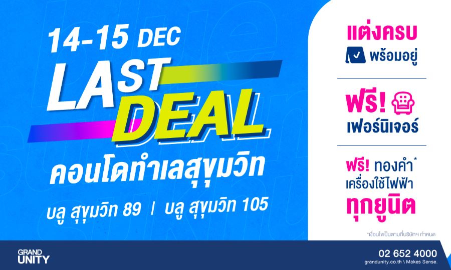 พบกับโปรโมชั่นสุดพิเศษ “LAST DEAL ดีลส่งท้ายปี” กับ 2 โครงการใหม่พร้อมอยู่ บนทำเลศักยภาพ ใกล้รถไฟฟ้า ทั้งโครงการ บลู สุขุมวิท 89 และโครงการ บลู สุขุมวิท 105 จาก แกรนด์ ยูนิตี้ ในวันที่ 14 – 15 ธันวาคมนี้ เท่านั้น ณ สำนักงานขายโครงการฯ โดยผู้ที่สนใจสามารถลงทะเบียนเพื่อรับสิทธิพิเศษ หรือนัดเข้าชมโครงการได้ที่ www.grandunity.co.th หรือสอบถามรายละเอียดข้อมูลเพิ่มเติมได้ที่ LINE@GrandUnity หรือ โทร. 0 2652 4000