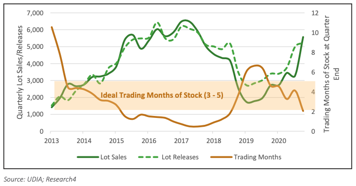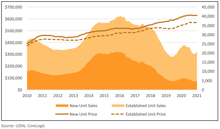 ในตลาดที่ดินสำหรับอยู่อาศัยนั้น อุปทานที่ดินดิบมีราคาสูงขึ้นมากเนื่องจากที่ดินดิบที่ออกสู่ตลาดมีจำกัด ทำให้เป็นข้อจำกัดต่อผู้ซื้อที่อยู่อาศัยไม่น้อย แต่ว่าทั้งผู้ซื้อและผู้ขายเองได้ปรับตัวต่อราคาที่ดินโดยการลดขนาดแปลงที่ดินลงและทำให้ผู้ซื้อยังคงมีกำลังซื้อแปลงที่ดินสำหรับอยู่อาศัยได้เรื่อยๆ โดยที่ไม่ติดขัด ซึ่งก็เป็นสิ่งที่เกิดขึ้นตลอดเวลาในรอบสิบปีที่ผ่านมา ส่วนทางด้านที่อยู่อาศัยแบบอพาร์ทเม้นท์นั้น ความยืดหยุ่นในการปรับลดราคาขายให้สอดรับกับกำลังซื้อมีค่อนข้างจำกัด เนื่องจากอาคารที่ขออนุญาตและเริ่มก่อสร้างแล้วปรับเปลี่ยนได้ยาก ตั้งแต่ปี 2012-2021 ราคา me-dian ของอพาร์ทเม้นท์เพิ่มขึ้นประมาณ 40% หรือ กว่า 4% ต่อปี แต่ว่า GSP ของรัฐ Victoria เพิ่มขึ้นเพียงประมาณ 20% หรือ 2.5% ต่อปีเท่านั้น ทำให้ความสามารถในการดูดซับอุปทานลดลงจากปีละประมาณ 40,000 หน่วยเหลือเพียงประมาณ 20,000 หน่วยเท่านั้น เมื่อพิจารณาอุปทานที่จะก่อสร้างเสร็จสิ้นออกสู่ตลาดแล้วตั้งแต่ปี 2021 ที่มีจำนวนถึงประมาณ 200,000 หน่วยแล้ว จะเห็นว่าอุปทานล้นอุปสงค์อย่างชัดเจน จำนวนอพาร์ทเม้นท์ใหม่ที่ขายได้เพิ่มขึ้นในปี 2020 หลังจากการยกเลิกมาตรการของ APRA และ อัตราดอกเบี้ยที่ลดลงมีเพียงประมาณ 4,000 หน่วยต่อปีเท่านั้น ในขณะที่แปลงที่ดินสำหรับอยู่อาศัยายได้เพิ่มขึ้นถึง 7,000 หน่วย นี่เป็นเหตุผลประการหนึ่งที่ราคาอพาร์ทเม้นท์ไม่อาจสูงขึ้นได้อีก ซึ่งตรงกันข้ามกับราคาต่อตารางเมตรของที่ดินที่ยังคงเพิ่มขึ้นเรื่อยๆ