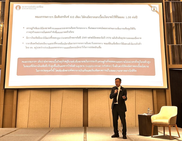 นายดอน นาครทรรพ ผู้ช่วยผู้ว่าการสายนโยบายการเงิน ธนาคารแห่งประเทศไทย เปิดเผยถึงสถานการณ์สงครามในตะวันออกกลางในงานโดยประเมินว่า จะส่งผลกระทบต่อเศรษฐกิจไทยอย่างมีนัยสำคัญ ผ่านต้นทุนของผู้ประกอบการและกำลังซื้อของประชาชนที่ลดลง แบงก์ชาติประเมินฉากทัศน์ความรุนแรงของสงครามไว้ 2 รูปแบบ คือ 1. สถานการณ์จบลงภายในครึ่งแรกของปีนี้ และ 2. สถานการณ์ยืดเยื้อไปจนถึงสิ้นปี ซึ่งหากเป็นกรณีหลัง ผลกระทบจะรุนแรงกว่ามาก เนื่องจากจะเกิดปัญหาการขาดแคลนวัตถุดิบ (Disruption) และราคาน้ำมันจะค้างอยู่ในระดับสูง แม้ราคาพลังงานอาจจะลดลงบ้างหากสงครามจบ แต่จะไม่กลับไปต่ำเท่าเดิมเพราะโครงสร้างพื้นฐานในการผลิตบางส่วนถูกทำลายไปแล้ว