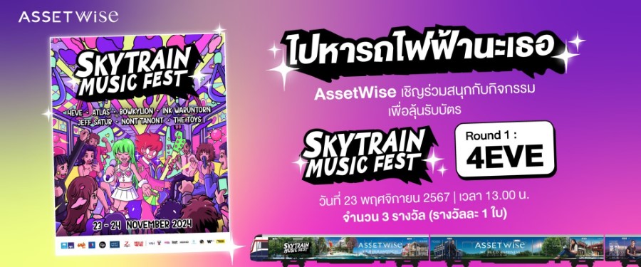 นอกจากขบวนความสนุกจากงานเทศกาลดนตรีแล้ว แอสเซทไวส์ ยังได้จัดแคมเปญสุดพิเศษ “ไปหารถไฟฟ้านะเธอ” เชื่อมความสุขให้ผู้โดยสารทุกท่านรวมถึงประชาชนทั่วไปที่ใช้บริการหรือพบเห็นขบวนพิเศษ Bogie of Happiness ของแอสเซทไวส์จากมุมใดก็ได้ มาร่วมแชร์โมเมนต์สุดพิเศษ ด้วยการถ่ายรูปและเขียนแคปชั่นให้โดนใจ โพสต์ในโซเชียลมีเดีย ลุ้นรับบัตรคอนเสิร์ตสุดแรร์ “SkyTrain Music Fest” รอบ 4EVE วันเสาร์ที่ 23 พฤศจิกายน 2567 รอบเวลา 13.00 น. จากแอสเซทไวส์ สามารถดูรายละเอียดและกติกาได้ทางเฟซบุ๊กแฟนเพจ www.facebook.com/AssetWiseThailand