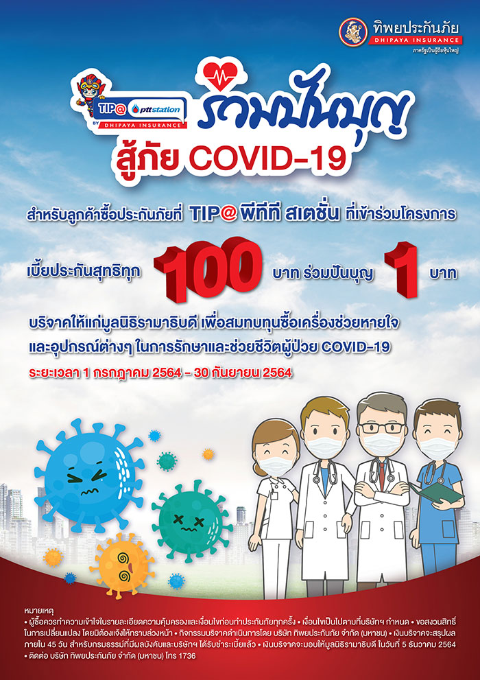 ดร.สมพร สืบถวิลกุล กรรมการผู้จัดการใหญ่ ทิพยประกันภัย ร่วมกับ นายสุชาติ ระมาศ รองกรรมการผู้จัดการใหญ่ธุรกิจค้าปลีก บริษัท ปตท. น้ำมันและการค้าปลีก จำกัด (มหาชน) และ นางธารินี สุทธิปริญญานนท์ นายกสมาคมการค้าผู้แทนจำหน่ายสถานีบริการน้ำมันพลังไทย ในฐานะตัวแทนของผู้ประกอบการที่เข้าร่วมโครงการ TIP@ พีทีที สเตชั่น ผนึกกำลังจัดโครงการ “TIP@ พีทีที สเตชั่น ร่วมปันบุญ สู้ภัย Covid-19” เพื่อช่วยเหลือผู้ป่วยจากโควิด-19 โดยเมื่อลูกค้าซื้อประกันภัยทุกประเภทผ่านช่องทางตัวแทนพีทีที สเตชั่น ที่เข้าร่วมโครงการ จำนวน 272 แห่งทั่วประเทศ ทุกๆ 100 บาท จากค่าเบี้ยประกันภัยสุทธิ จะหัก 1 บาท นำไปร่วมบริจาคให้ มูลนิธิรามาธิบดี เพื่อสมทบทุนซื้อเครื่องช่วยหายใจและอุปกรณ์ต่างๆ ในการรักษา และช่วยชีวิตผู้ป่วยจากโควิด-19 สามารถร่วมเป็นส่วนหนึ่งของพลังในการปันบุญ สู้ภัยโควิด-19 ให้ชาวไทยได้ผ่านพ้นวิกฤตการณ์ในครั้งนี้ได้ ตั้งแต่วันนี้ – วันที่ 30 กันยายน 2564