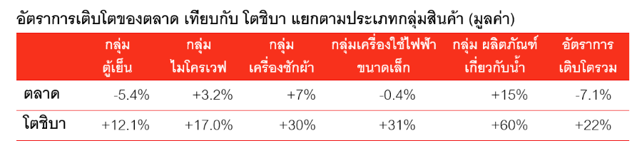 ความสำเร็จดังกล่าว ที่ทำให้โตชิบาเติบโตถึง 22% เกิดจากการที่ผู้บริโภคตอบรับสินค้าโตชิบาในกลุ่มที่พรีเมียมยิ่งขึ้น โดยเฉพาะกลุ่มตู้เย็นมัลติดอร์ ซึ่งมีอัตราเติบโตเพิ่มขึ้นถึง 60% เครื่องซักผ้าฝาหน้า เพิ่มขึ้น 61% หม้อหุงข้าว เพิ่มขึ้น 11% ไมโครเวฟ เพิ่มขึ้น 17% พัดลม เพิ่มขึ้น 166% และเครื่องทำน้ำอุ่น เพิ่มขึ้น 60% นอกจากนี้ ยังเป็นปีที่บริษัทฯ สามารถทำยอดขายรวมได้สูงถึง 2.4 ล้านเครื่องต่อปี