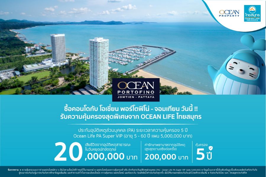 โอเชี่ยน พรอพเพอร์ตี้ และไทยสมุทรประกันชีวิต จึงขอมอบข้อเสนอพิเศษ รับฟรีพรีเมียมแพ็คเกจประกันชีวิตคุ้มครองสูงสุด 20 ล้านบาท เมื่อซื้อคอนโดในโครงการ โอเชี่ยน พอร์โตฟิโน่ จอมเทียน-พัทยา รับฟรีแพ็คเกจประกันชีวิตคุ้มครองสูงสุด 4 ล้านบาท สำหรับการซื้อคอนโดในโครงการ โอเชี่ยน แกรนด์ เรสซิเดนซ์ มิตรภาพ-ขอนแก่น และรับฟรีแพ็คเกจประกันชีวิตคุ้มครองสูงสุด 12 ล้านบาท สำหรับการซื้อทาวน์โฮม หรือ อาคารพาณิชย์ในโครงการ โอเชี่ยน ทาวน์ เมือง-รัษฎา ภูเก็ต โดยทุกแพ็คเกจ จะให้ระยะเวลาความคุ้มครองนานถึง ปี นอกจากนี้ สมาชิก OCEAN CLUB ที่สนใจและทำการจองคอนโดหรือบ้านผ่านทั้ง โครงการ ยังจะได้รับส่วนลดเงินสดเพิ่มอีกสูงสุด 100,000 บาท แคมเปญนี้ตั้งแต่วันนี้ถึง 30 มิถุนายน 2565