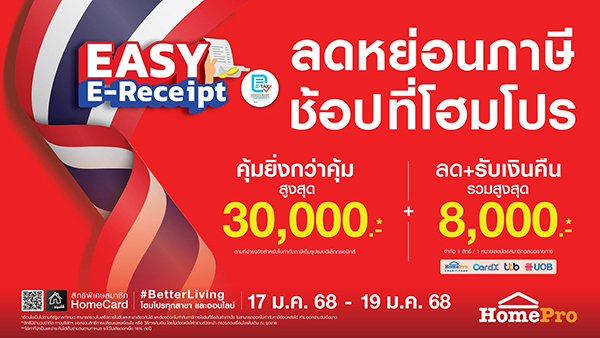 โฮมโปร ร่วมสนับสนุนมาตรการช้อปลดหย่อนภาษี เปิดตัวแคมเปญ HomePro Easy E-Receipt มอบความสนุก ช้อปคุ้มค่ารับต้นปีใหม่ และตรุษจีน ให้ผู้บริโภค 2 ต่อ! รับสิทธิ์ลดหย่อนภาษี สูงสุด 30,000 บาท (ตามที่จ่ายจริงสำหรับใบกำกับภาษีเต็มรูปแบบอิเล็กทรอนิกส์) พร้อมมอบความพิเศษเฉพาะสมาชิกโฮมการ์ด และเอกสิทธิ์พิเศษเฉพาะผู้ถือบัตรเครดิต HomePro VISA, CardX, TTB, UOB และ บัตร HomePro First Choice รับส่วนลดและเครดิตเงินคืน รวมสูงสุด 8,000 บาท เริ่มช้อปความคุ้มค่าได้ตั้งแต่ 16 มกราคม 2568 นี้ ที่โฮมโปร เมกาโฮม ทุกสาขา และออนไลน์!