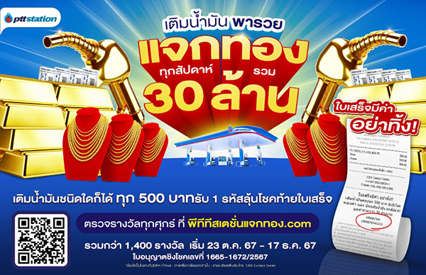 เติมน้ำมันกับ พีทีที สเตชั่น วันนี้ แล้วลุ้นรวยไปด้วยกัน เติมปั๊บ รับสิทธิ์ลุ้นปุ๊บ! ไม่ต้องลงทะเบียนเข้าร่วมกิจกรรม! เพียงคุณเติมน้ำมันชนิดใดก็ได้ครบทุก 500 บาท รับรหัสลุ้นโชคง่าย ๆ 1 สิทธิ์ท้ายใบเสร็จ เก็บใบเสร็จไว้ให้ดี! พีทีที สเตชั่น จับแจกทุกสัปดาห์ รวม 8 ครั้ง สัปดาห์ละ 176 รางวัล อาทิ ทองคำแท่งหนัก 20 บาท จำนวน 1 รางวัล สร้อยคอทองคำหนัก 1 บาท จำนวน 40 รางวัล และบัตรน้ำมันมูลค่า 10,000 บาท จำนวน 135 รางวัล รวมของรางวัลทั้งหมดกว่า 1,400 รางวัล มูลค่ากว่า 30 ล้านบาท ยิ่งเติม ยิ่งมีสิทธิ์ลุ้น!